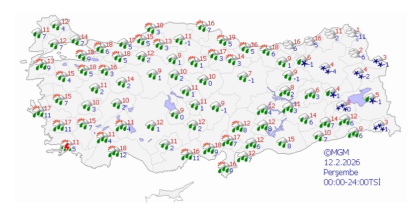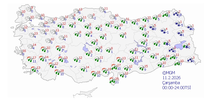 Meteoroloji, yağışların Kıyı Ege, Manisa, Antalya’nın doğusu, Rize, Artvin, Hatay, Adana, Osmaniye, Kahramanmaraş’ın batısı, Erzurum, Ağrı, Bitlis ile Tunceli, Bingöl ve Muş çevrelerinde yerel olarak kuvvetli olmasını öngörüyor.Hava sıcaklığının iç ve batı bölgelerde 3 ila 5 derece azalacağı, diğer bölgelerde önemli bir değişiklik beklenmediği bildirildi.