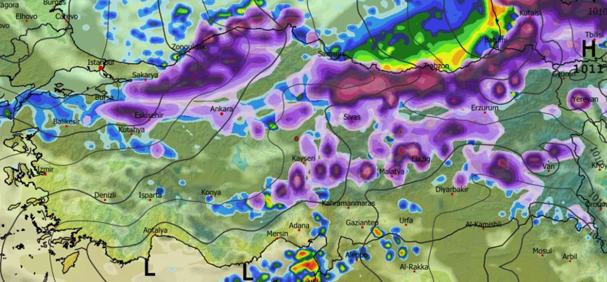 Haritalarda mor ve koyu tonlarla işaretlenen alanlar, yoğun kar olasılığına dikkat çekiyor. Ankara, Eskişehir, Sivas ve Kayseri hattı ile Doğu Anadolu’nun büyük bölümünde kar yağışının yer yer kuvvetli olacağı belirtiliyor. Yüksek rakımlı bölgelerde tipi ve yoğun kar ihtimali öne çıkıyor.
