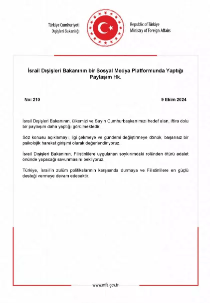 Dışişleri Bakanlığı’ndan yapılan açıklamada, Türkiye’nin Filistin’e en güçlü desteği sürdüreceği vurgulandı. Açıklamada, “İsrail Dışişleri Bakanı’nın, ülkemizi ve Cumhurbaşkanımızı hedef alan, asılsız ve iftira dolu bir paylaşım daha yaptığı görülmektedir. Bu açıklamayı, gündem değiştirme amacı taşıyan başarısız bir psikolojik harekat olarak değerlendiriyoruz. Filistinlilere uygulanan zulümdeki rolü nedeniyle adalet önünde hesap vereceği günü bekliyoruz. Türkiye, İsrail’in baskıcı politikalarına karşı durmaya ve Filistin’e olan desteğini sürdürmeye kararlıdır” denildi.