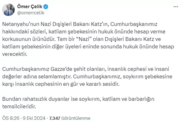 İsrail Dışişleri Bakanı Katz’a tepki, Dışişleri Bakanlığı’nın ardından AK Parti’den de geldi. Parti Sözcüsü Ömer Çelik, X hesabından yaptığı açıklamada, Katz’ın Cumhurbaşkanı Erdoğan’a yönelik ifadelerinin “katliam şebekesinin hukuk önünde hesap verme korkusunun bir yansıması” olduğunu belirtti. Çelik, Katz’ı “Nazi” olarak nitelendirirken, “Cumhurbaşkanımız, Gazze’deki şehitleri insanlık ve insani değerler adına selamlamıştır. Soykırım şebekesine karşı en kararlı ses olan Cumhurbaşkanımız, bu zulümden rahatsızlık duyanları insanlık karşıtı olarak görüyoruz” ifadelerini kullandı.