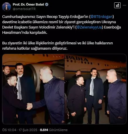 Cumhurbaşkanı Recep Tayyip Erdoğan’ın daveti üzerine Ukrayna Devlet Başkanı Volodimir Zelenskiy, Türkiye’ye resmî bir ziyaret için geldi. Zelenskiy, Esenboğa Havalimanı’nda, Ticaret Bakanı Ömer Bolat tarafından coşku içinde karşılandı. Bakan Bolat, sosyal medya hesabından yaptığı paylaşımda, “Cumhurbaşkanımız Sayın Recep Tayyip Erdoğan’ın davetiyle ülkemize resmi bir ziyaret gerçekleştiren Ukrayna Devlet Başkanı Sayın Volodimir Zelenskiy’i Esenboğa Havalimanı’nda karşıladık. Bu ziyaretin, iki ülke ilişkilerinin daha da güçlenmesine ve halklarımızın refahına katkı sağlamasını temenni ediyoruz” ifadelerine yer verdi.