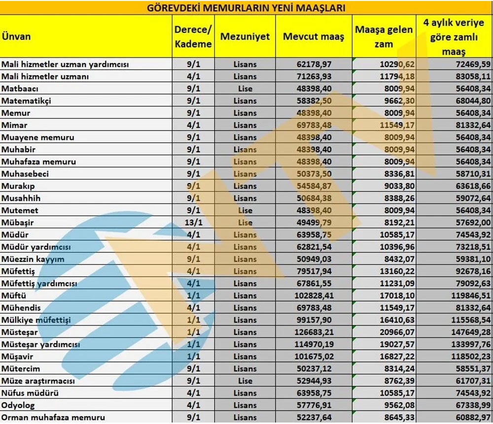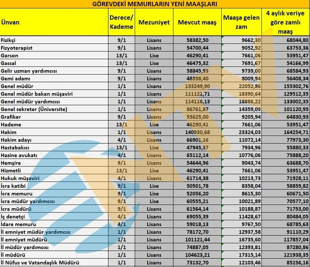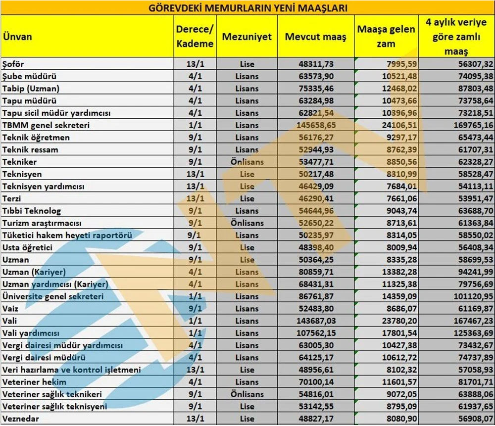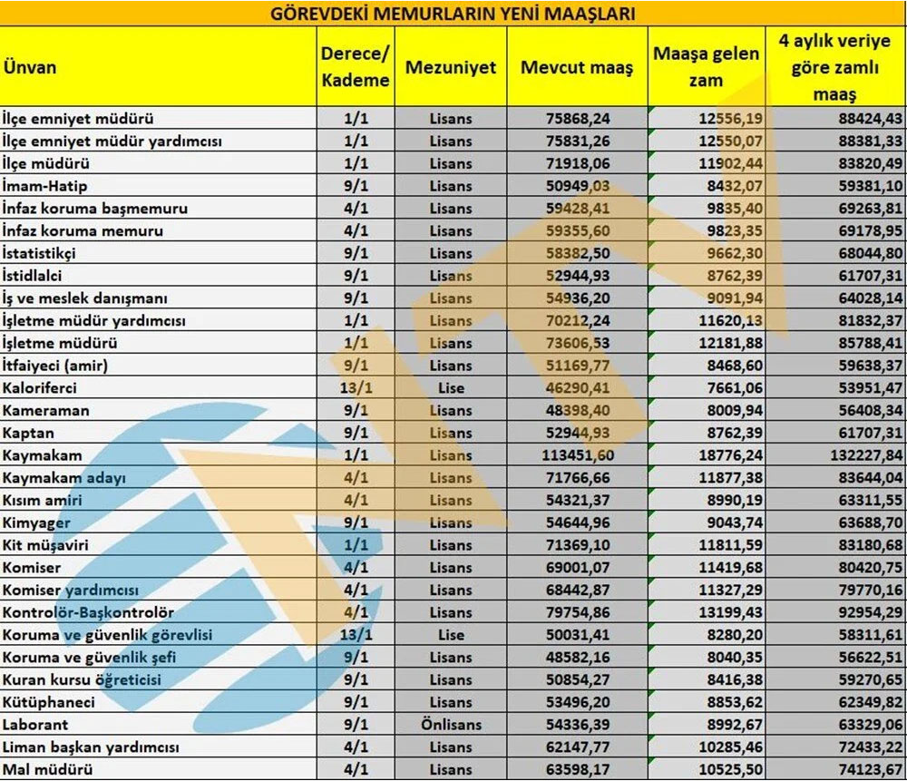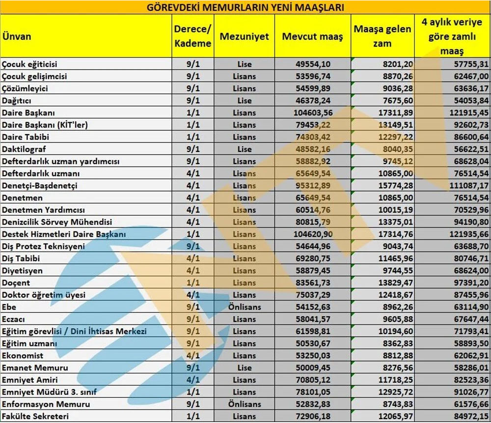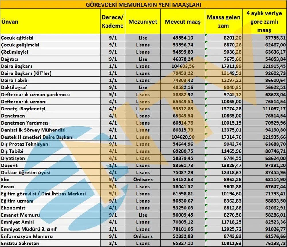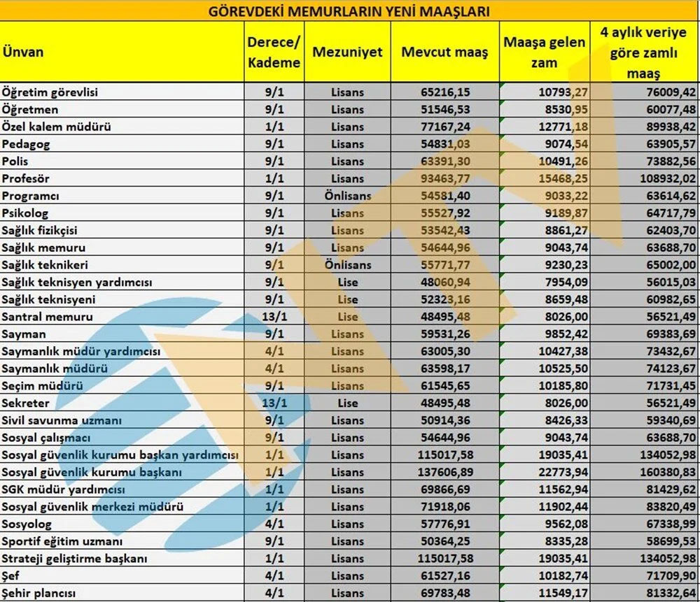 Polis, öğretmen, hemşire, profesör, memur, başkomiser, vaiz, avukat, araştırma görevlisi ve mühendis gibi ünvanlarda alınacak zamlı maaşlar da netleşti.