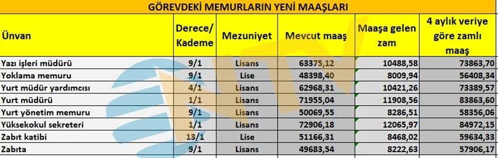 Polis, öğretmen, hemşire, profesör, memur, başkomiser, vaiz, avukat, araştırma görevlisi ve mühendis gibi ünvanlarda alınacak zamlı maaşlar da netleşti.