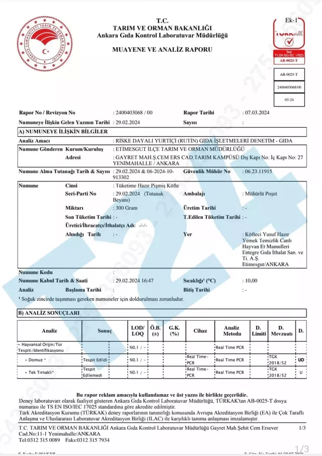 Tarım ve Orman Bakanlığı’nın muayene ve analiz raporlarına göre, 27 Şubat ve 7 Mart tarihlerinde alınan numunelerde, dana eti döneri ve tüketime hazır pişmiş köftede domuz eti tespit edildi. Yapılan incelemelerde, tek tırnaklı veya kanatlı hayvan eti ise bulunmadı. Analizler kapsamında, pişmiş köfte etinden 300 gram, dana eti dönerinden ise 400 gram numune alındı ve her iki üründe domuz eti bulundu. Köfteci Yusuf’un adı, bakanlığın taklit ve tağşiş listesinde açıklanmadan önce firmanın harekete geçerek konuyu mahkemeye taşıdığı ve yürütmeyi durdurma kararı alarak adının açıklanmasını engellediği iddia edildi. Ancak, bu iddialara ilişkin herhangi bir mahkeme kararı henüz ortaya çıkmadı. Haberler.com olarak şirket yetkilileriyle gerçekleştirdiğimiz görüşmeler sonuçsuz kalırken, Köfteci Yusuf’un avukatı Ali Uslu, konuyla ilgili bilgisi olmadığını, açıklama yapamayacağını ve iddialara yanıt veremeyeceğini belirtti.