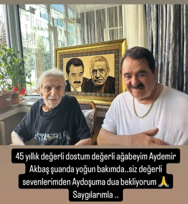 İbrahim Tatlıses, uzun zamandır kanserle mücadele eden yakın dostu Aydemir Akbaş’ın yoğun bakımda olduğunu duyurdu. Tatlıses, Akbaş ile birlikte bir fotoğrafını paylaşarak, “45 yıllık değerli dostum, değerli ağabeyim Aydemir Akbaş şu anda yoğun bakımda… Siz değerli sevenlerimden Aydoşuma dua bekliyorum. Saygılarımla…” ifadelerini kullandı. 2. Sayfa’da yer alan habere göre, usta sanatçının entübe edildiği iddia edildi.