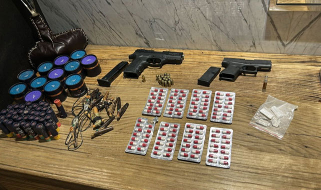 Şüphelilerin evlerinde yapılan aramalarda, 3 ruhsatsız tabanca, 111 adet uyuşturucu hap, 4 parça kristal şeklinde uyuşturucu madde, çok sayıda uyuşturucu madde kullanım aparatı ve öğütücüler ele geçirildi. Ayrıca, 9 deste boş kağıt ve 19 adet orta kısımları kesik sahte dolar bulundu.