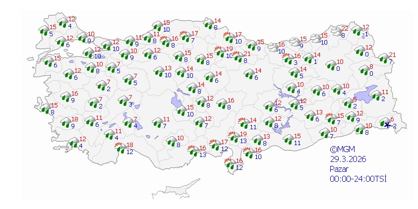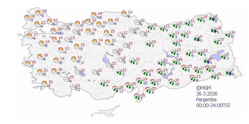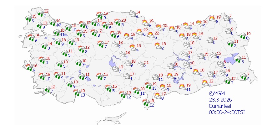 Meteoroloji Genel Müdürlüğü’nün tahminlerine göre; bugün yurt genelinde hava parçalı ve çok bulutlu olacak. Marmara, Ege, Akdeniz, İç Anadolu, Batı ve Orta Karadeniz’in iç kesimleri, Güneydoğu Anadolu’nun batısı ile Samsun, Şırnak, Hakkari, Ağrı, Kars, Ardahan ve Erzurum, Bitlis, Siirt’in doğusunda yağış bekleniyor.Yağışların Batı Karadeniz’in yüksekleri ile Doğu Anadolu’nun doğusunda karla karışık yağmur ve kar şeklinde olması öngörülüyor. Antalya’nın merkez ve doğusunda ise kuvvetli yağışlar etkili olacak.