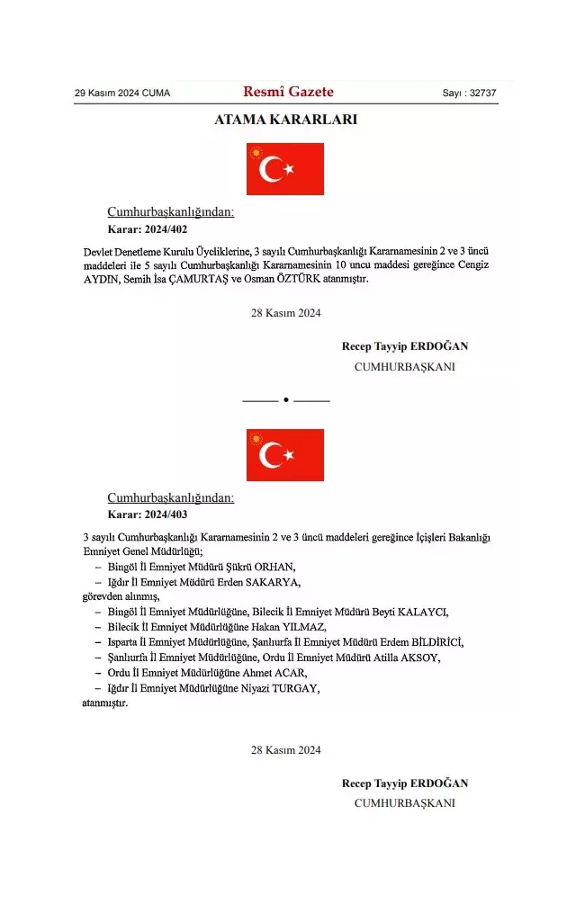 Resmi Gazete’de yayımlanan Cumhurbaşkanlığı atama kararları dikkat çekti. Cumhurbaşkanı Erdoğan’ın imzasıyla duyurulan kararlara göre, Devlet Denetleme Kurulu’na üç yeni üye atandı: Cengiz Aydın, Semih İsa Çamurtaş ve Osman Öztürk. Ayrıca, Bingöl İl Emniyet Müdürü Şükrü Orhan ile Iğdır İl Emniyet Müdürü Erden Sakarya görevden alındı.
