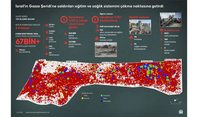 Gazze’deki sağlık merkezlerinin yüzde 95’i kısmen veya tamamen hizmet dışı. Aynı şekilde okulların da yüzde 95’i bombardımanlarda yok oldu. Mısır tarafından hazırlanan “Gazze’nin Erken İyileştirilmesi, Yeniden İnşası ve Kalkınması” başlıklı 91 sayfalık rapora göre, İsrail’in saldırılarının toplam ekonomik maliyeti 29,9 milyar dolar. Raporda, en fazla zararın 15,8 milyar dolarla konut sektöründe olduğu ve toplam hasarın yüzde 53’ünü oluşturduğu kaydedildi.