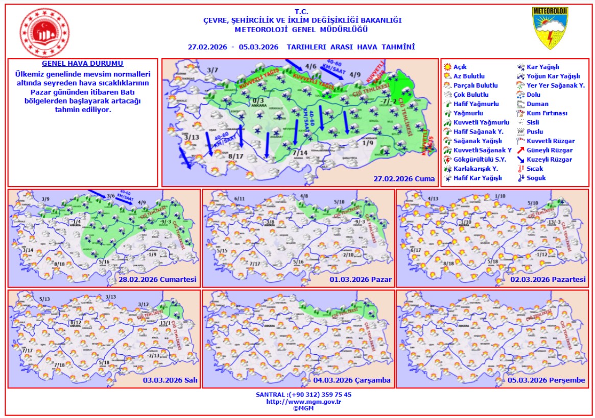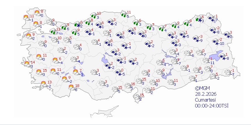 Yağışların cumartesi günü iç, kuzey ve doğu illerinde devam etmesi, pazar günü ise Doğu Karadeniz kıyıları ile Kars, Ardahan ve Iğdır çevrelerinde etkili olması bekleniyor. Yeni haftada ise yurt genelinde hava güneşli olacak. Pazartesi günü hava sıcaklıkları İstanbul’da 13, İzmir’de 17, Ankara’da 10 derece ölçülecek.