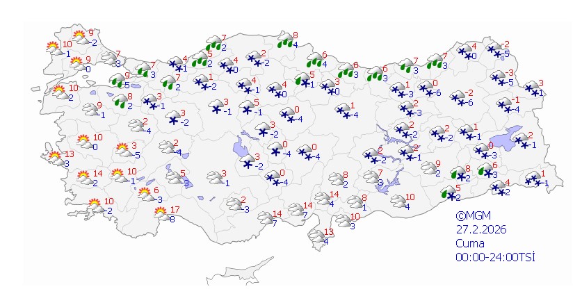 Karadeniz kıyıları ve Doğu Anadolu’nun doğusunda kuvvetli olması öngörülen yağışların kıyı kesimlerde yağmur ve sağanak, iç kesimlerde ise karla karışık yağmur ve kar şeklinde olacağı tahmin ediliyor.