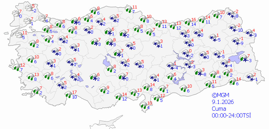 Bugün kuzey, iç ve batı kesimler parçalı ve çok bulutlu olacak. Marmara’nın batısı ile Kıyı Ege’de yağmur ve sağanak görülecek, diğer bölgeler ise az bulutlu ve açık olacak. İç ve doğu bölgelerde buzlanma, don, pus ve yer yer sis bekleniyor.Doğu Karadeniz’in iç kesimlerinin yüksekleri ve Doğu Anadolu’nun doğusundaki yüksek kar örtüsüne sahip eğimli alanlarda çığ riski bulunuyor.