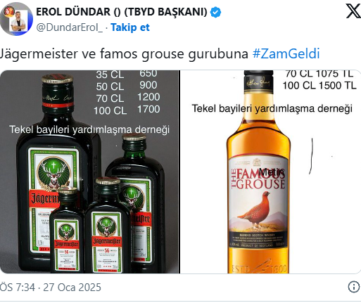 Yeni yılla birlikte alkole yapılan zamlara bir yenisi daha eklendi. Tekel Bayileri Yardımlaşma Derneği (TBYD) Başkanı Erol Dündar, zam haberini sosyal medyadan verdi.Dündar, Jägermeister ve ‘The Famous Grouse’ grubuna gelen zamları duyurdu.İşte yaptığı paylaşım ;