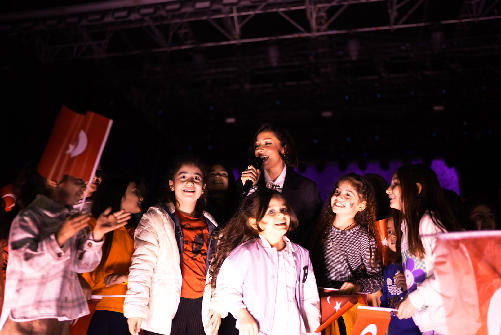 konseri izlemeye gelen minik hayranlarını sahneye alarak, onlarla birlikte